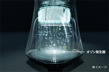 ①タンクの水をオゾンで除菌し、清潔な水での加湿が可能